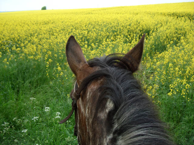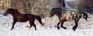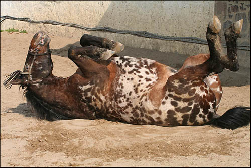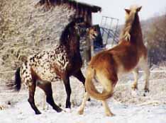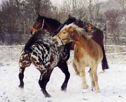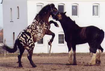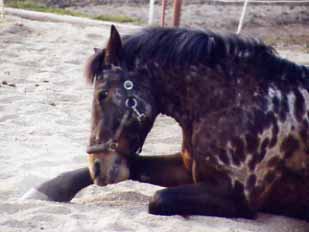 Herzlich Willkommen. Auf dieser Seite möchte ich ein bisschen von meinem Knabstrupper Lucas erzählen. Der Knabstrupper ist, wie man auf den Bildern sieht, ein Pferd ( mit einem großen Kopf voll bunter Knete). Ich habe dieses Pferd seit 2001, da war er 4 und ein bisschen schüchtern. Wie ich zu ihm kam, ist auch eine sonderbare Geschichte. Mein altes Pferdchen Elfa war leider vestorben. Wenn überhaupt ein neues Pferd, wollte ich durch nichts an sie erinnert werden. Sie war eine Fuchsstute. So zog ich los und guckte mir verschiedene andere Pferde an, fand aber kein passendes. Auf dem Rückweg von einer Suchaktion fiel mir ein Zettel mit der Verkaufsanzeige von diesem gepunkteten Kerlchen in die Hände und wir haben ihn nach Tierarztuntersuchung gekauft, obwohl ich ihn zum Reiten viel zu unbequem fand. Niemand konnte genau sagen, woher er kam,über einen Händler vom Pferdemarkt in Havelberg und dort verlaufen sich die Spuren. Er ist ein recht typischer Knabstrupper, hat aber keine Papiere. Fazit nach 6 Jahren Freunschaft mit diesem Burschen: Er ist wirklich ein fetziges Kerlchen, der sehr viel denkt und sehr schnell lernt. Er ist immer noch täglich eine Herrausforderung. Sein Dickschädel ist nicht so einfach zu überzeugen, wenn ich aber mit Beharrlichkeit und Ruhe dranbleibe, dann macht Lucas alles für mich und das freiwillig. Mit Zwang oder unter Stress erreicht man bei ihm nichts, allenfalls Ärger. Wenn ich selbst nicht entspannt bin, darf ich von ihm auch nichts fordern. Er ist ein wirklich feines Pferd. Und ich bin sicher, da er nach klassischen Gesichtspunkten ohne Stress und Zwang ausgebildet wird, ist er auch ein glückliches Pferd. Ich habe in unserer Beziehung auch eine Menge gelernt, Geduld zum Beispiel, Beharrlichkeit, Entschiedenheit,Stärke und daß die Kraft oft in der Ruhe liegt .
